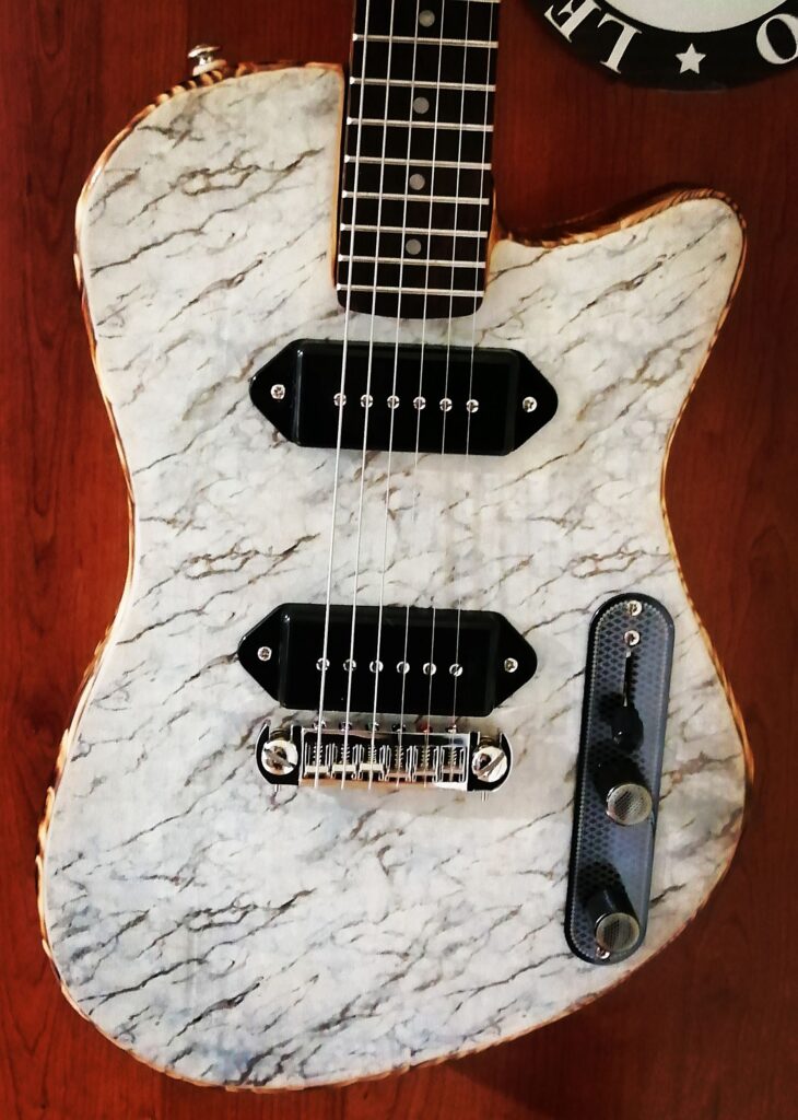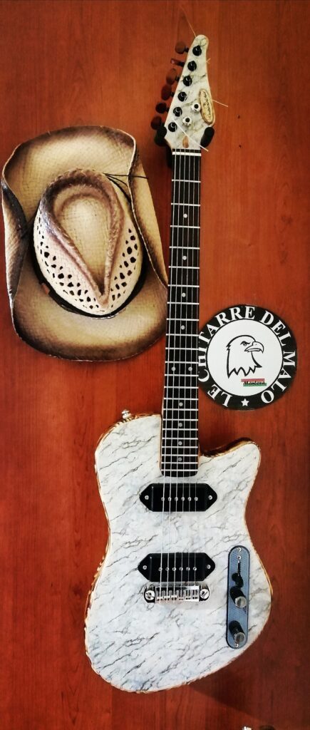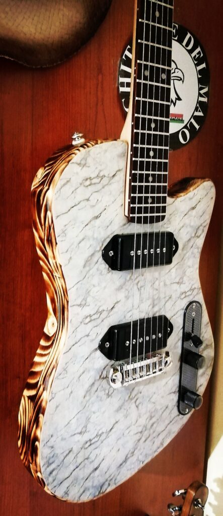 The body, while inspired by classic T-style shapes but with more sinuous and unique contours, is made unmistakable by its finish: a bold white/gray marble effect coating skillfully applied to the top and the modified design headstock front, for a “stone-like” look with strong visual impact.
